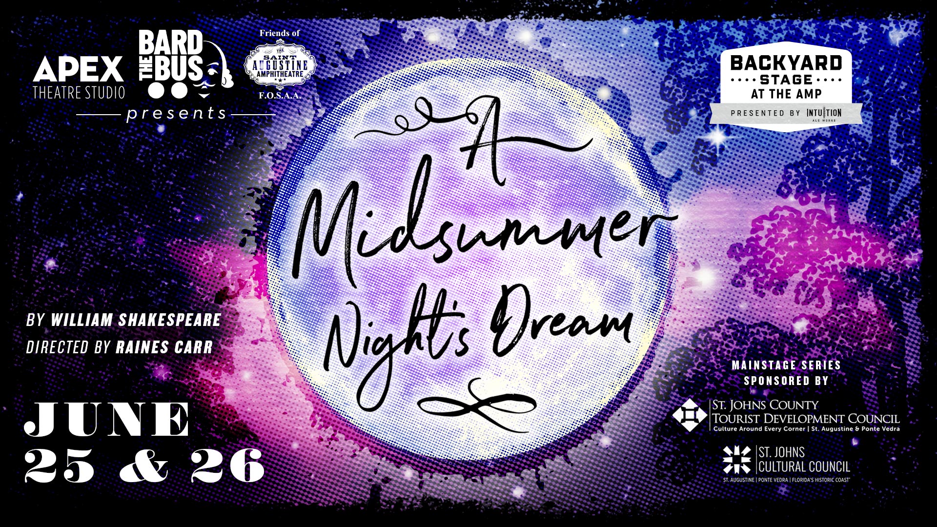 Apex Theater Studio will present two performances of A Midsummer Night’s Dream as part of their Bard Bus tour: their annual touring Shakespeare production on Wednesday, June 25th and Thursday, June 26th at 7:30 p.m. at the Backyard Stage at the St. Augustine Amphitheatre.